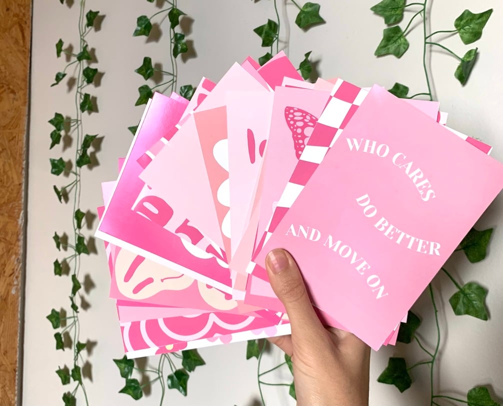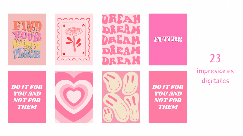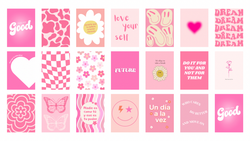 Kit collage rosado de pared con 23 impresiones digitales. Sumérgete en un mundo de vibraciones color de rosa. Nuestra decoración te transporta a una era de alegría y expresión personal. Los estampados a cuadros maravillosos se entrelazan con figuras de flores, caras sonrientes y más, con frases de amor propio y motivación. Cada rincón irradia positividad y autenticidad.